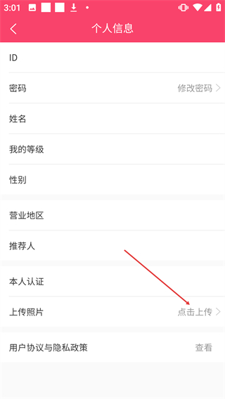 2、在个人信息页面点击【上传照片】对应的【点击上传】选项,会弹出操作选择弹窗。