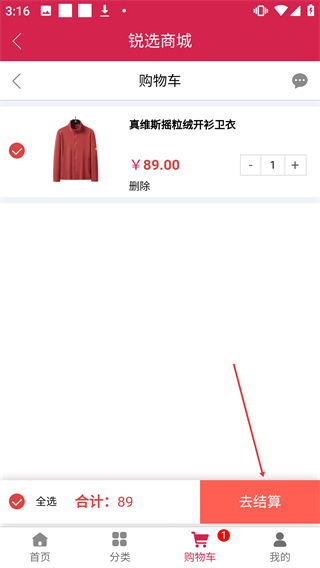 3、在【购物车】页面勾选【真维斯摇粒绒开衫卫衣】后点击【去结算】按钮。
