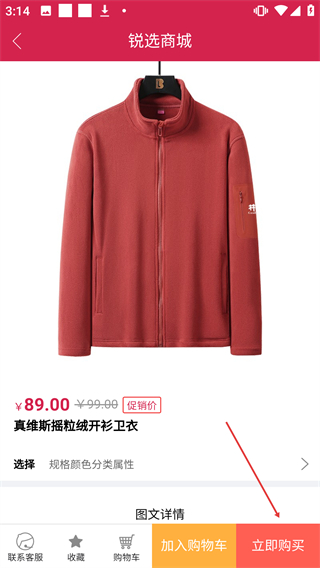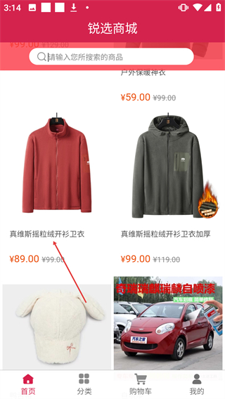 1、在【锐选商城】首页找到【真维斯摇粒绒开衫卫衣】并点击进入其详情页。