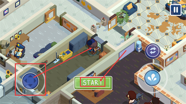 1、通过移动按钮操控角色,点击【START】开启关卡,需按目标完成场景内的清洁任务。