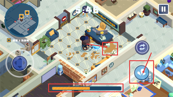 2、使用清洁按钮处理污渍区域,进度条会显示任务完成度,需在倒计时内清理指定杂物。