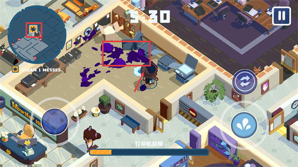 3、清理紫色污渍类杂物,完成【CLEAN-1-MESSES】目标,同时留意场景内的其他待处理事项。