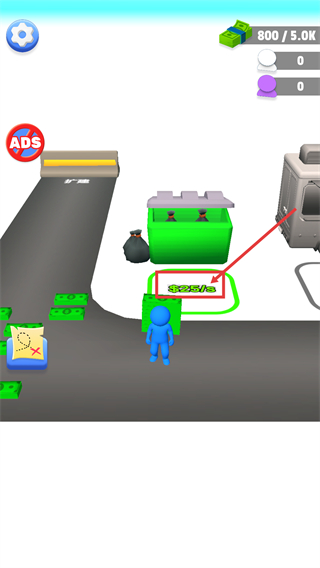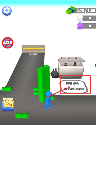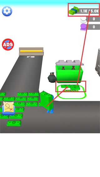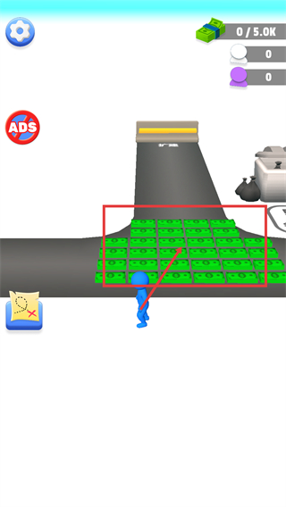 1、当前目标为【0/5.0K】资金时,优先收集场景内的绿色钞票堆,快速积累初始资金推进进度。