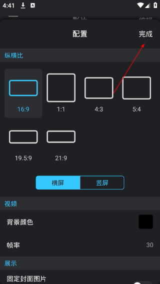 3、在配置界面选择视频参数(如16:9的纵横比),设置完成后点击【完成】。