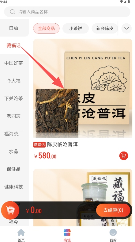 2、打开软件进入商城首页找到目标商品如“陈皮临沧普洱”。