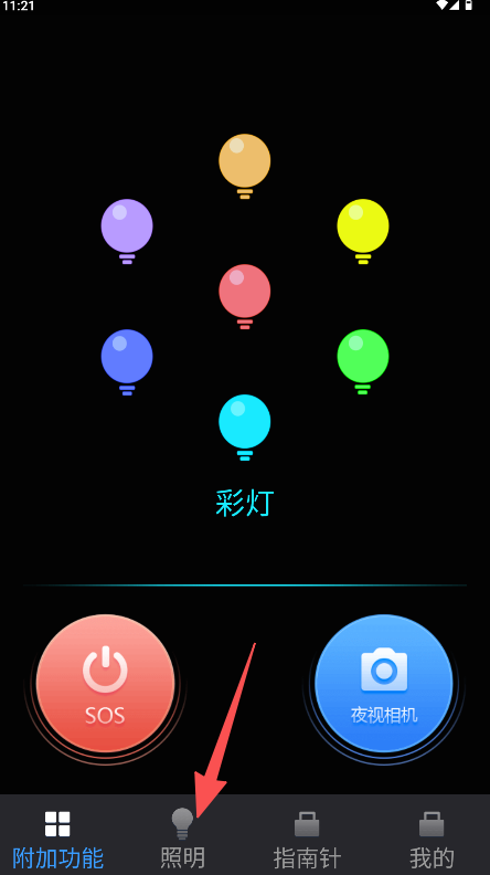 1、在应用主界面点击底部“照明”进入手电筒功能主页面。