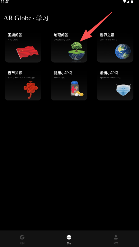 2、找到并点击“地理问答”功能图标进入知识问答模块。