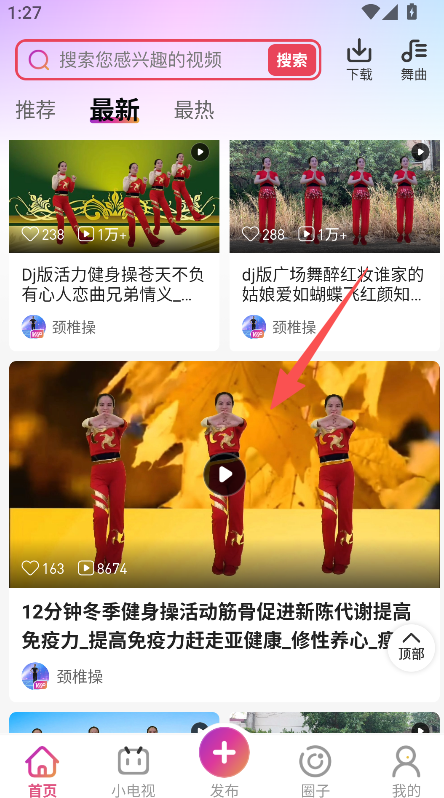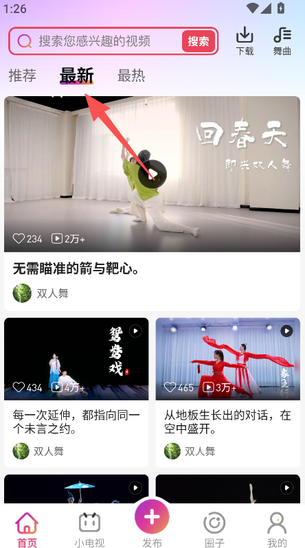 1、打开软件,在首页选择推荐、最新或最热分类,浏览舞蹈视频。