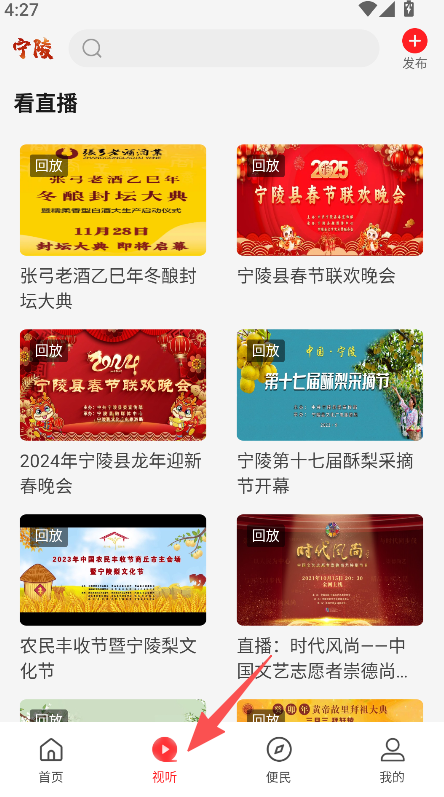 1、打开软件进入视听板块查看直播回放内容。