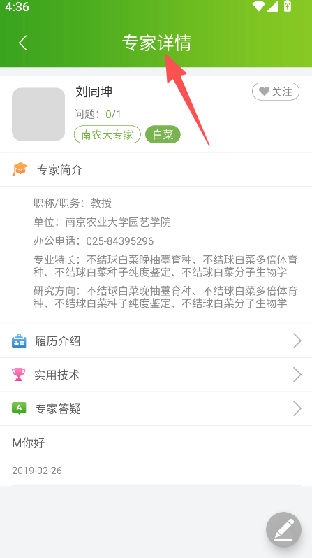 3、提供专家详情查看功能,点击专家可查看其简介履历实用技术及答疑内容,获取农业专业信息。