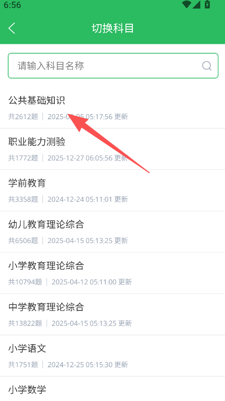 1、涵盖公共基础知识等多类教师招聘备考科目,显示各科目题量及更新时间,适配不同备考方向的题目获取需求。