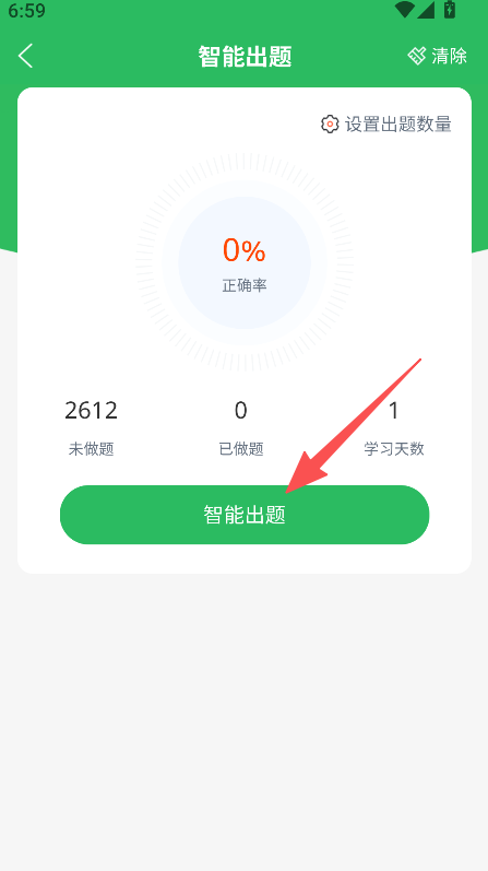 2、具备智能出题功能,可设置出题数量,记录未做题已做题及学习天数,启动刷题流程。