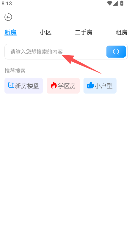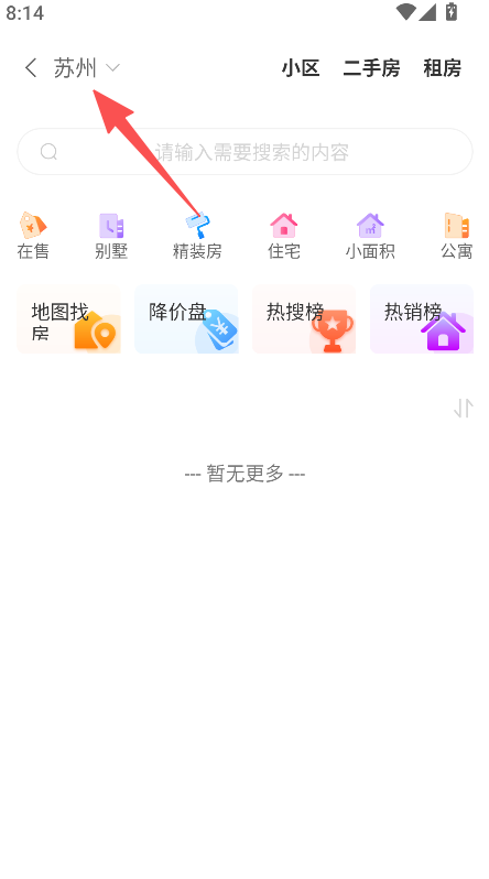 2、配备搜索功能,可输入内容查找房产,结合推荐选项辅助搜索。