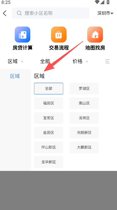 1、区域筛选功能,从深圳多区域中选择,精准定位意向地段,聚焦对应目标房源。