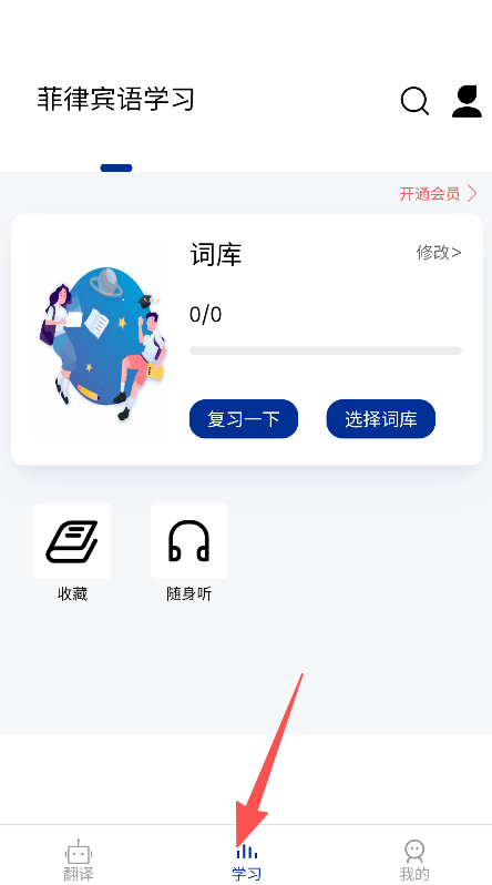 3、整合复习收藏随身听功能,覆盖学习各环节,形成连贯的菲律宾语词汇学习流程。
