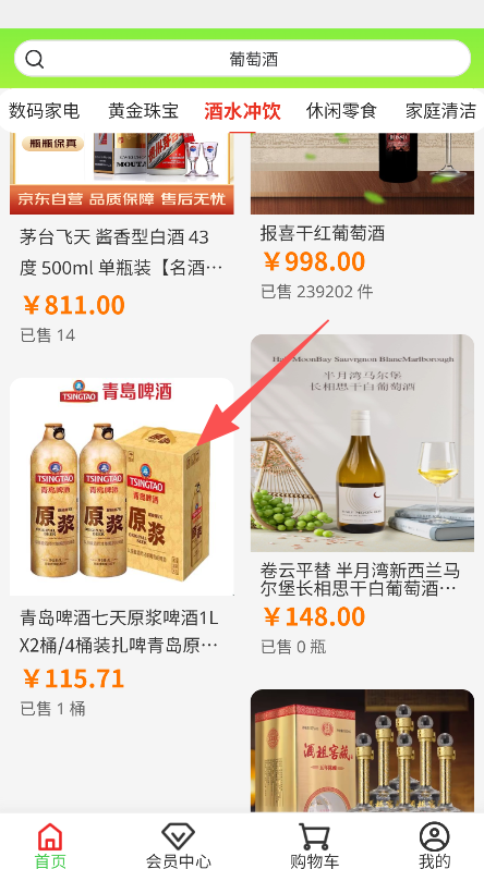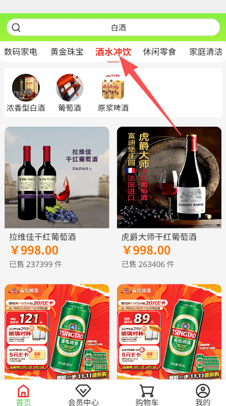 1、点击酒水冲饮分类,进入对应商品展示页面。