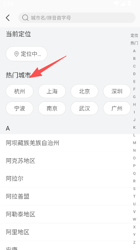 1、选择热门操作城市完成定位。