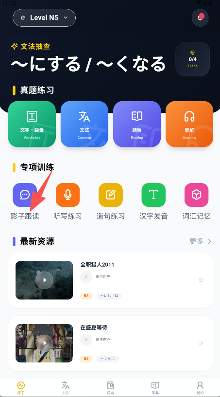 2、进入跟读课程列表页、根据左上角难度标识(如N3)选择并点击目标课程。