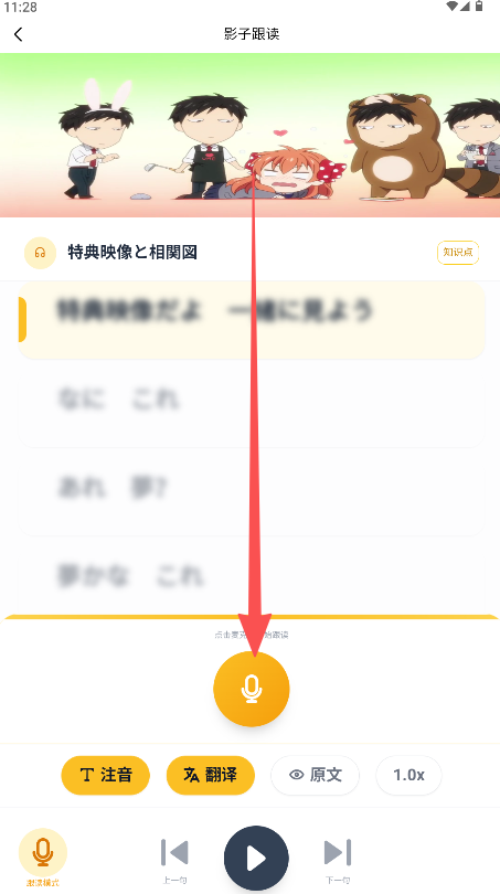 3、在课程视频详情页点击底部橙色麦克风按钮、即可开始跟读录音与练习。