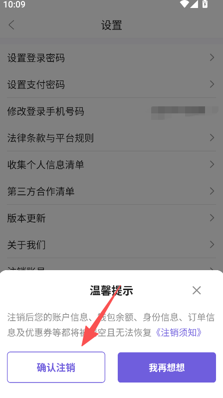 3、注销账号前弹出温馨提示,说明账户信息清空无法恢复,明确操作的后果。