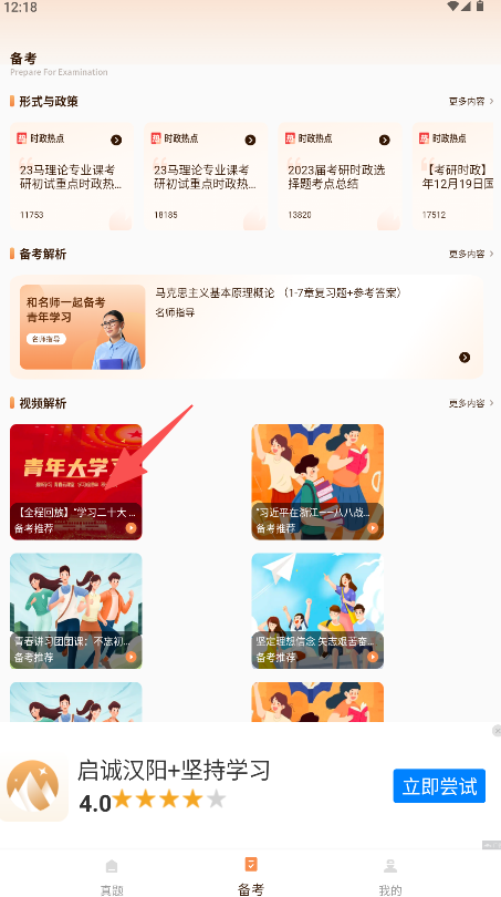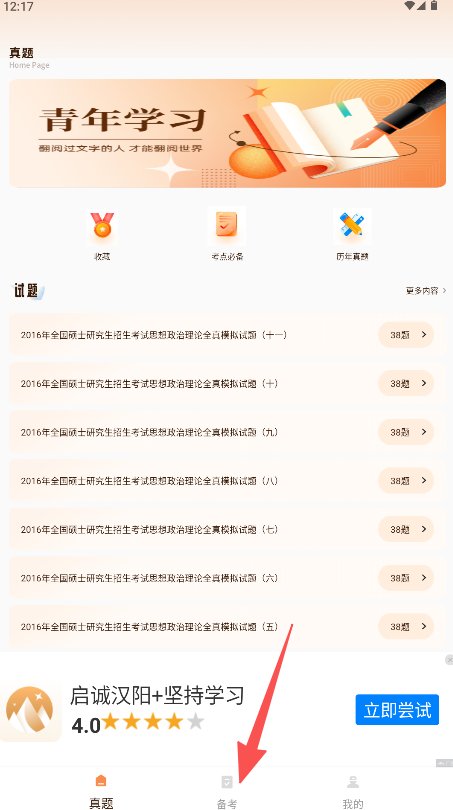 1、首页与导航设计直接突出备考与真题两大核心板块,便于快速定位核心学习资源。