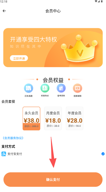 3、在会员中心选择套餐阅读协议并选择支付方式最后点击“确认支付”完成购买。