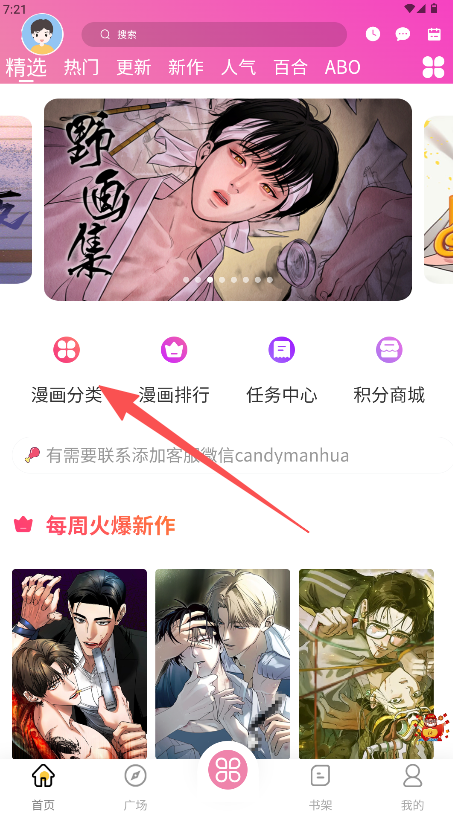 1、在首页点击粉色“漫画分类”进入分类筛选页面。