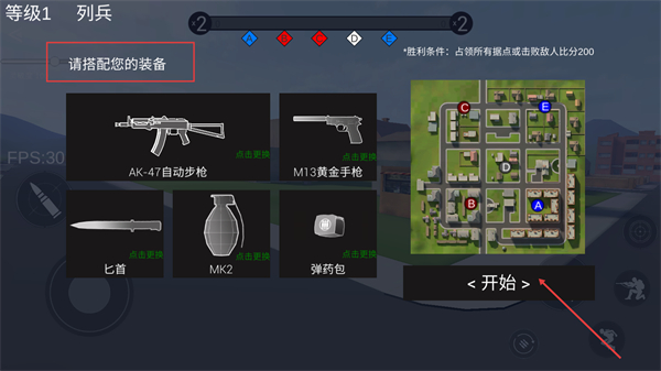 1、在装备搭配界面选择【AK-47-自动步枪】等装备,点击【开始】按钮进入战场,参与据点争夺任务。