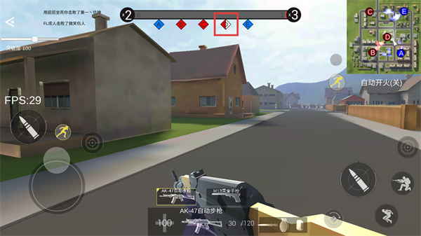 2、进入战场后,操控角色持武器推进,留意顶部阵营进度条,攻击敌方单位提升己方得分。