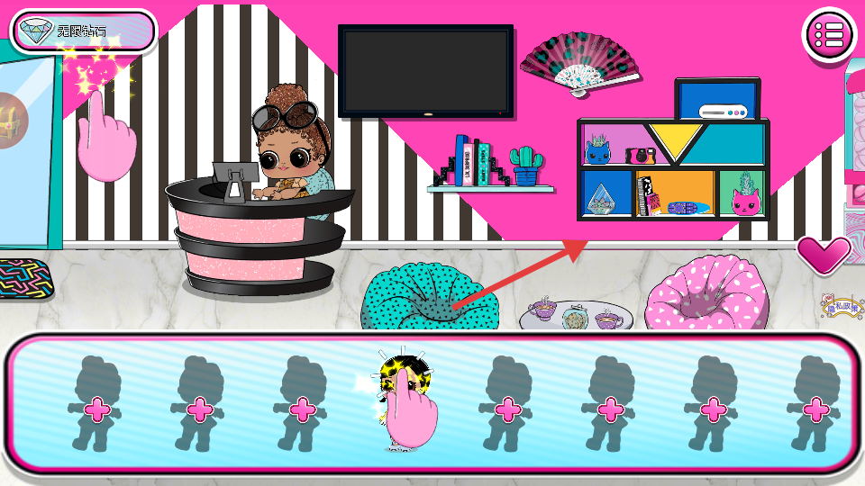 1、进入游戏场景,能看到【柜台】【豆袋椅】等装饰,准备开展角色相关操作。