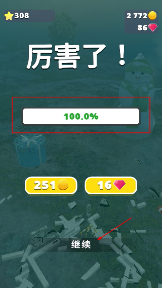 4、完成任务后,获取奖励,点击【继续】进入下一关。