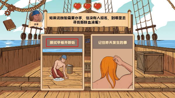 2、面对“寻找新鲜血液”的剧情选项,选择【擦拭甲板并聆听】,推进剧情同时解锁后续选择。