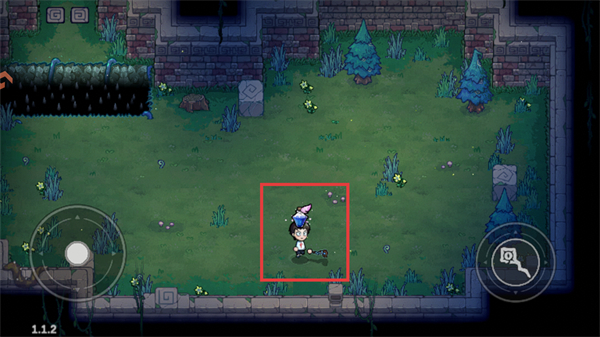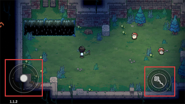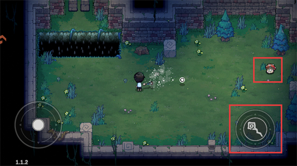 1、先通过左侧【移动轮盘】控制角色移动,靠近右侧带【10】标记的蘑菇敌人,再准备用右侧技能键发起攻击。