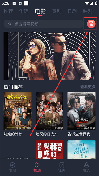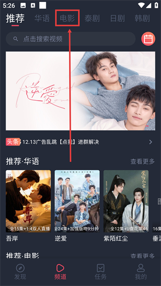 1、在【频道】页面,点击顶部的【电影】标签,可切换到电影类内容板块。