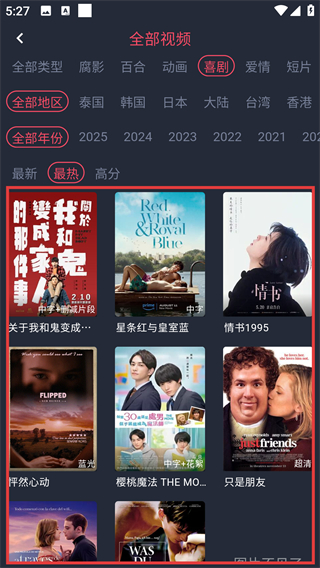 3、在筛选界面中,选择【喜剧】类型与【最热】排序,可筛选出热门的喜剧类电影。