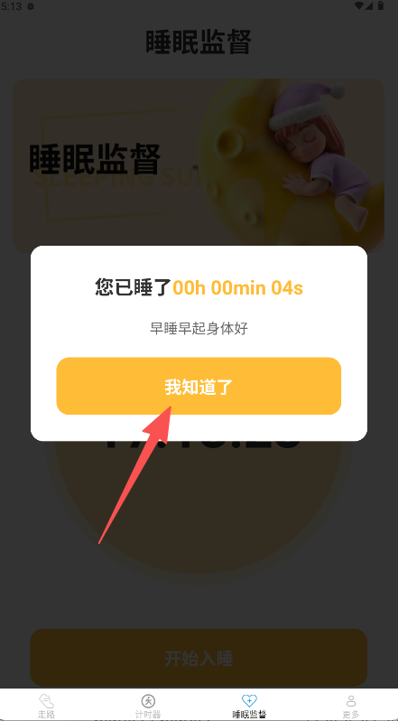 3、结束后界面将弹出提示框显示总睡眠时长,点击“我知道了”按钮关闭提示。