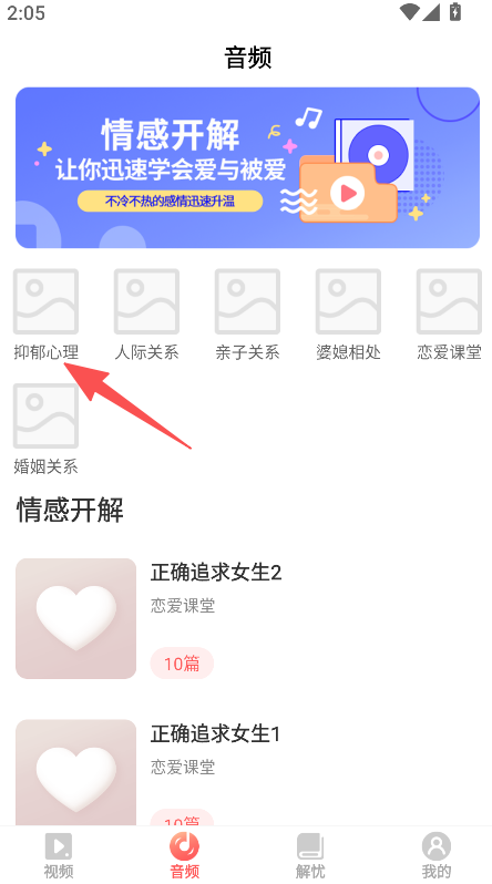 1、设音频板块,覆盖抑郁心理、人际关系等情感主题,提供多类情感相关的内容资源。