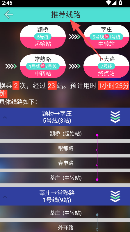 3、查询后展示推荐线路含换乘、站点数等,信息维度全面,助力出行路线的清晰规划。