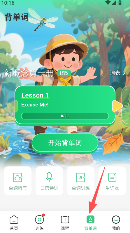 1、设背单词板块,分新概念课程(如Lesson1),提供单词学习的核心入口。