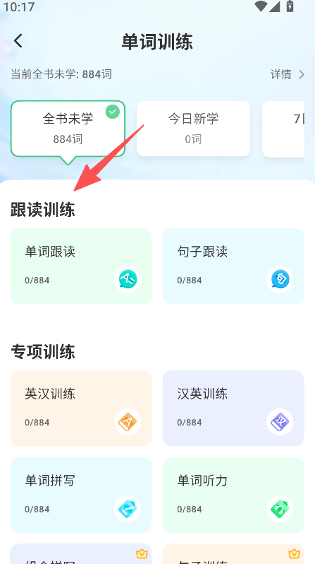 2、含单词训练功能,下分跟读、专项训练等,开展多类型的英语学习训练。