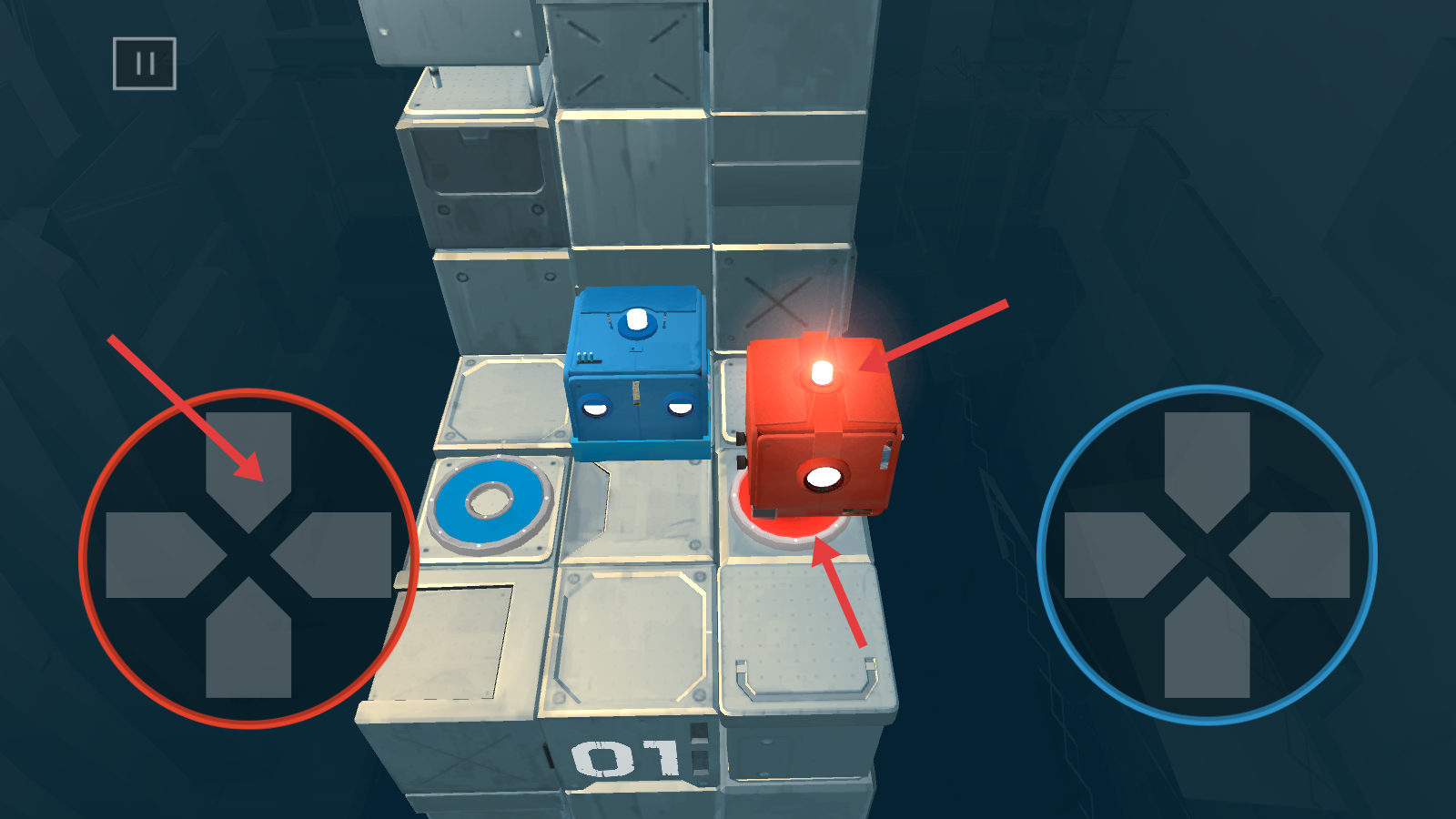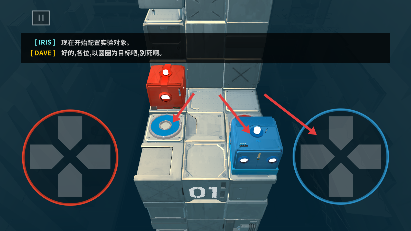 3、根据提示,操控红色和蓝色方块,以圆圈为目标移动。