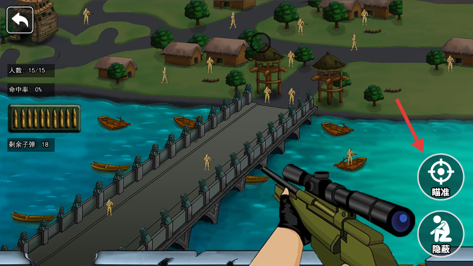 2、在游戏中,点击右侧“瞄准”按钮,使用狙击枪瞄准桥上或其他区域的敌人。