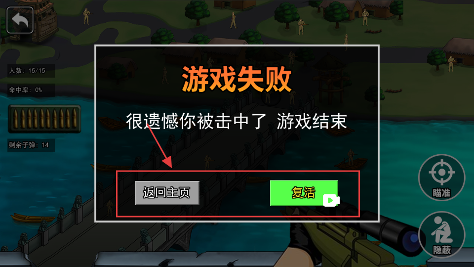 4、若游戏失败(被敌人击中),可选择“返回主页”重新开始,或点击“复活”(观看视频)继续当前游戏。