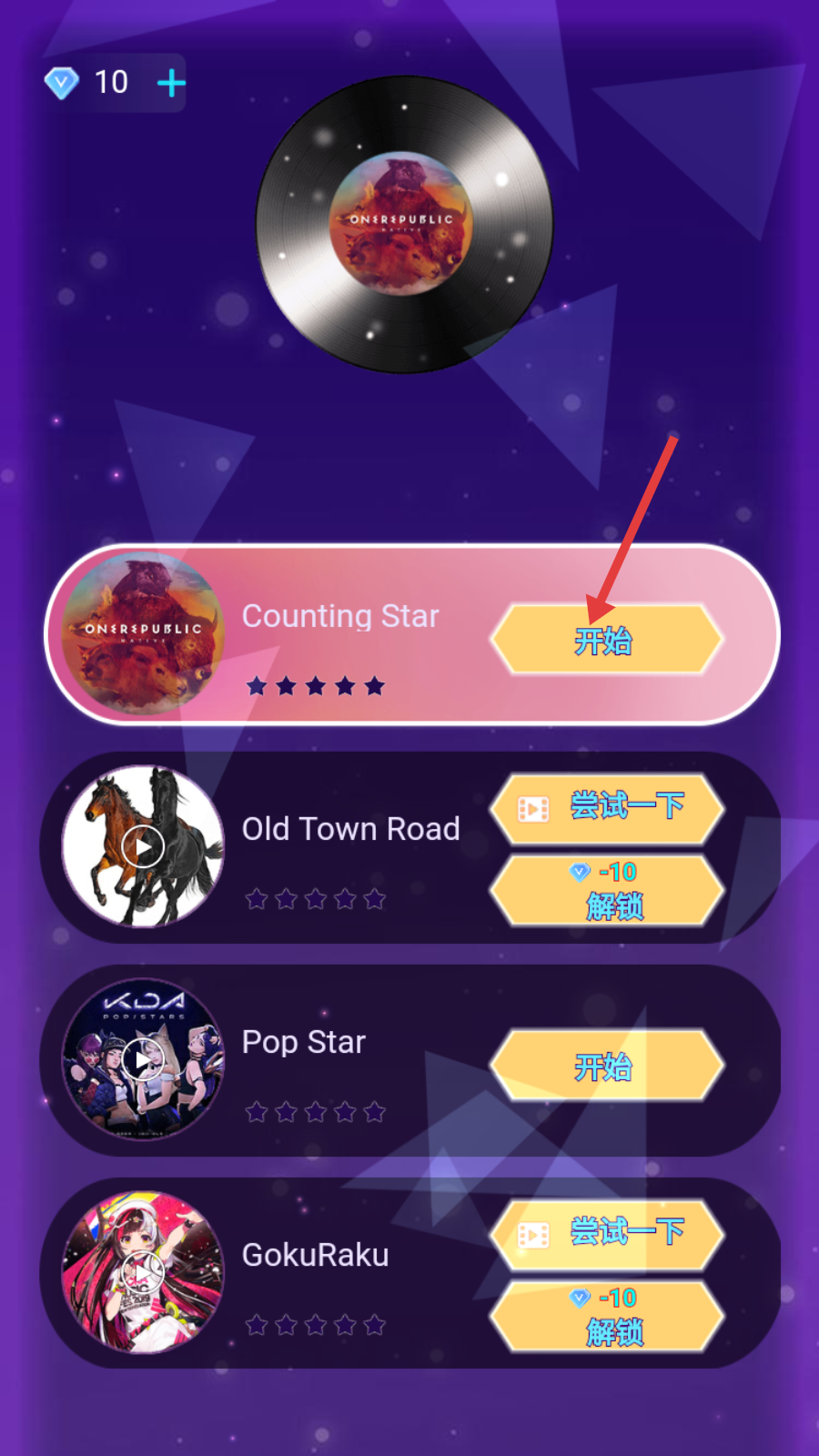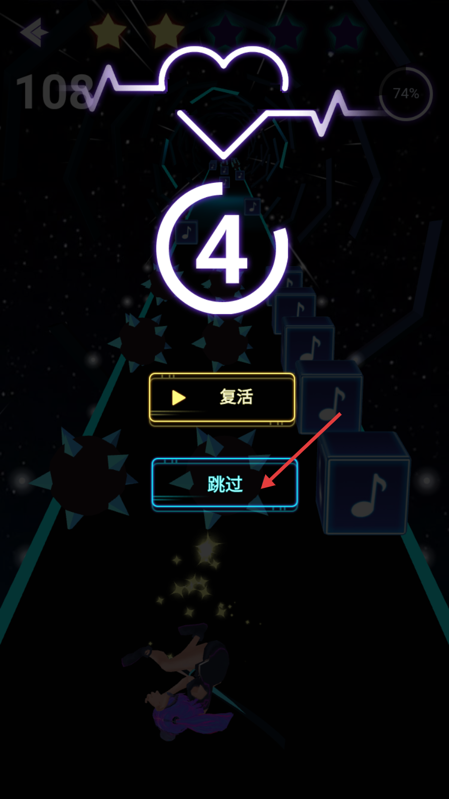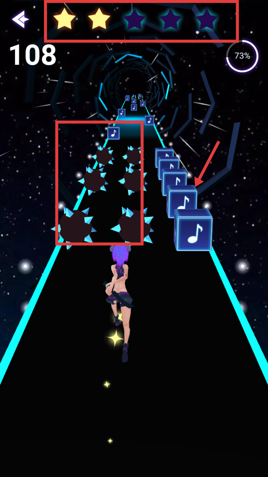 3、避开带刺障碍物,持续收集音符,积累分数和星星。
