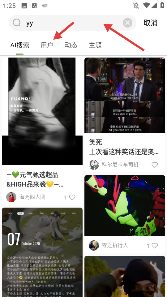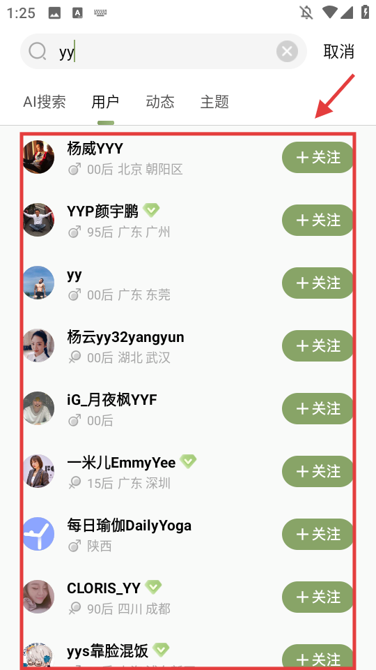 2、在搜索框输入关键词,点击“用户”标签,查看相关主播列表。
