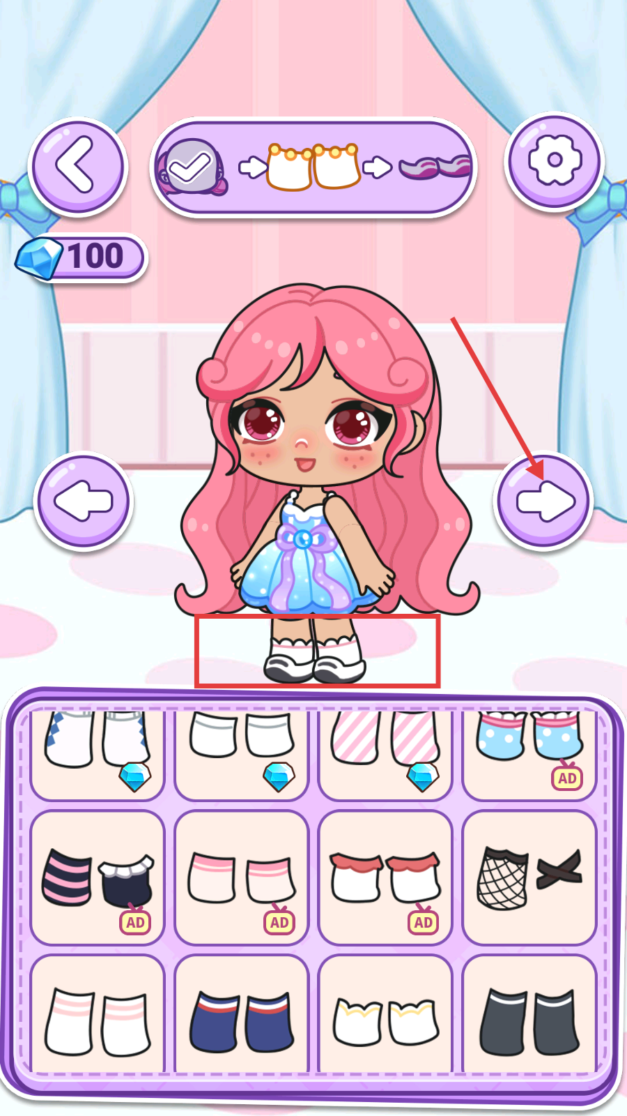 4、还能选择袜子等配饰,装扮完成后可点击箭头进行下一步。