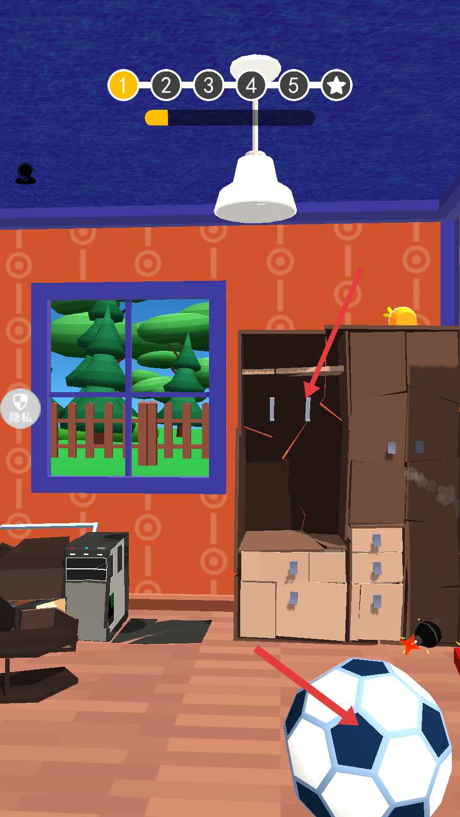 2、利用场景中的物品,如足球等,破坏房间内的柜子等物体。
