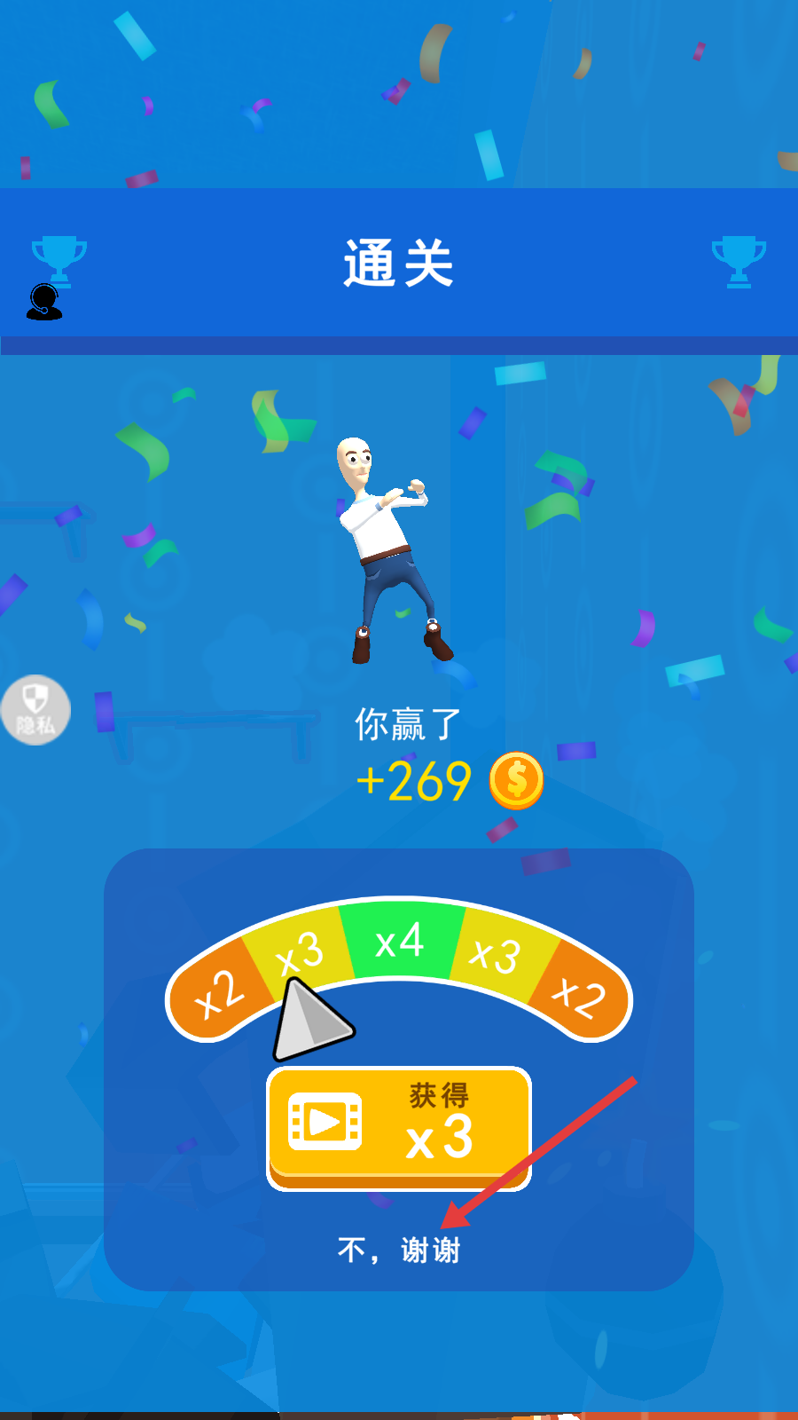 4、通关后,可选择是否观看视频获得奖励,若不想要,点击【不,谢谢】。