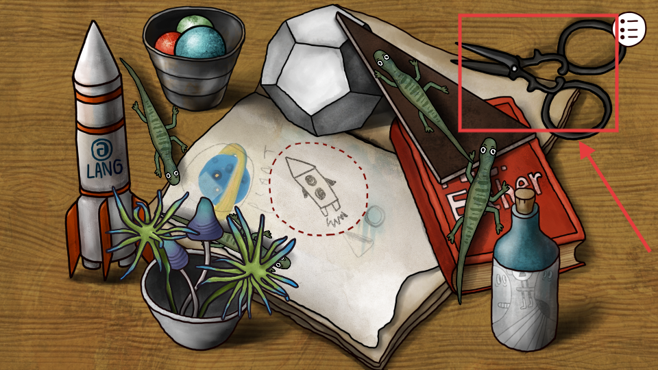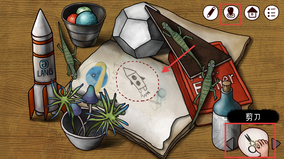 3、使用已拾取的【剪刀】道具,点击纸张上的【火箭】图案区域,触发剪纸互动,推进线索获取。