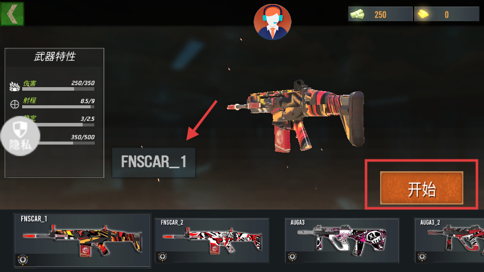 2、选用【FN-SCAR-1】(属性优秀),点击【开始】进入战斗,利用武器特性高效狩猎目标。